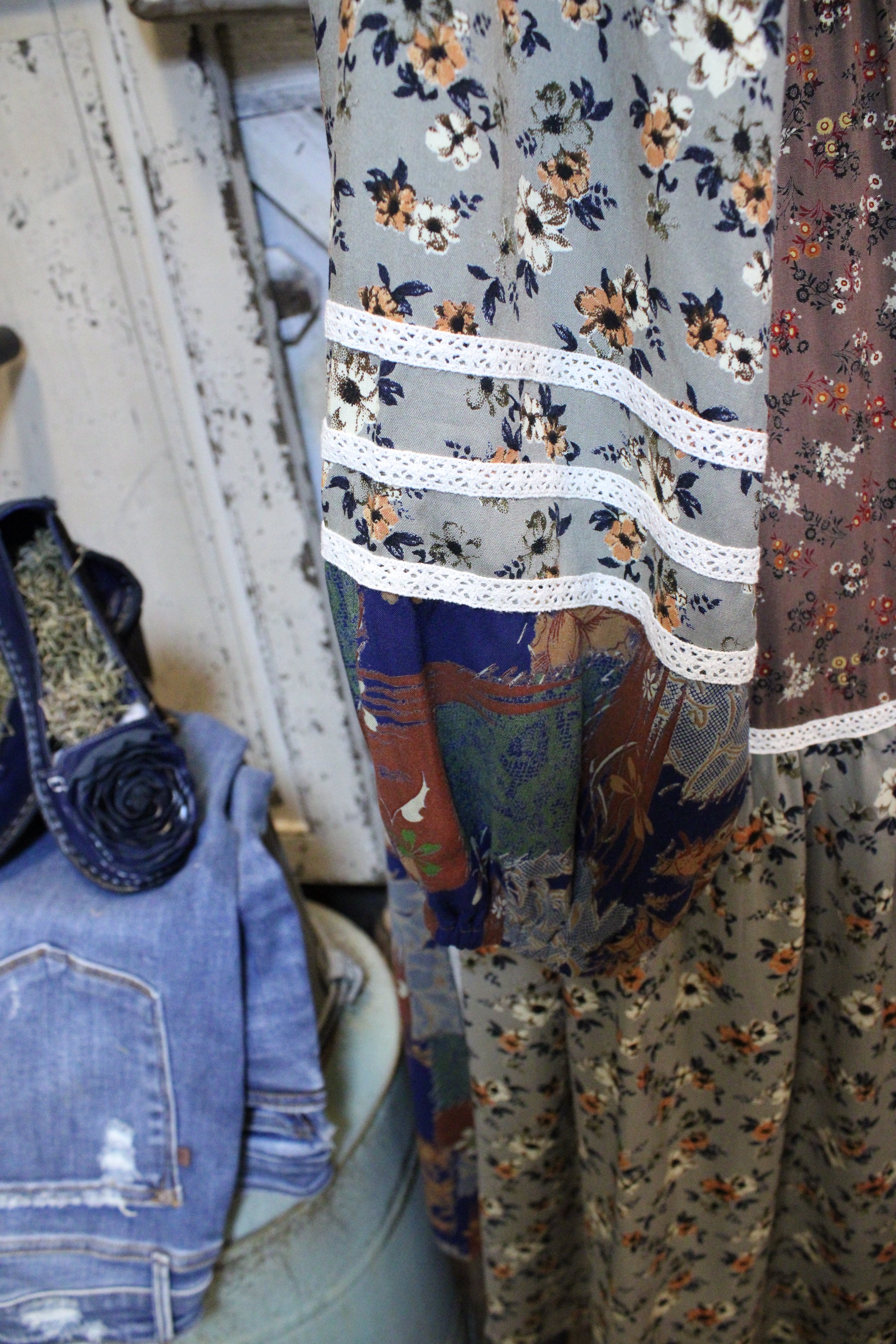 Introducing the Maple Creek Dress- This dress is giving vintage storybook charm meets boho farm-girl soul. The Wildflower Patchwork Dress blends soft, flowy florals and earthy tones into one beautifully timeless piece. With billowy sleeves, lace trim accents, and a flattering tie-front neckline, it’s made to make you feel effortlessly feminine.