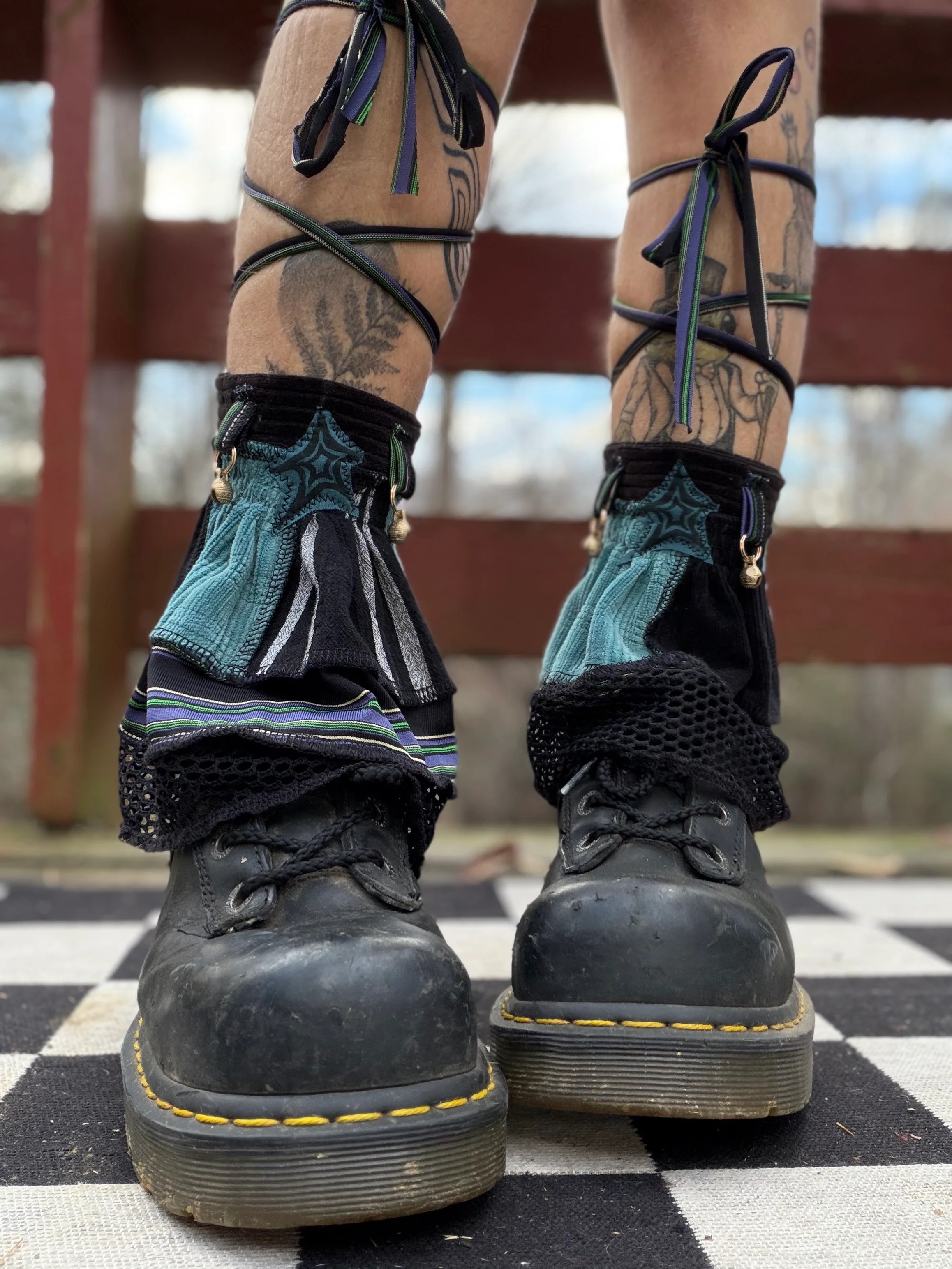 This handcrafted leg warmer set blends edgy punky style with celestial whimsy—crafted from layered patchwork fabrics (teal corduroy, black-and-white striped knit, and mesh trim), it features a central star-shaped applique motif (in moody teal tones) for a bold, mystical vibe. The dual-tone (black-green-purple) adjustable crisscross ties wrap snugly around the calf, while tiny brass bells add a playful jingle with movement. The ruffled layered hem (mixed with striped and mesh details) pairs perfectly with bare feet or chunky boots, making it a standout accessory for festivals, casual outings, or eclectic-style outfits.