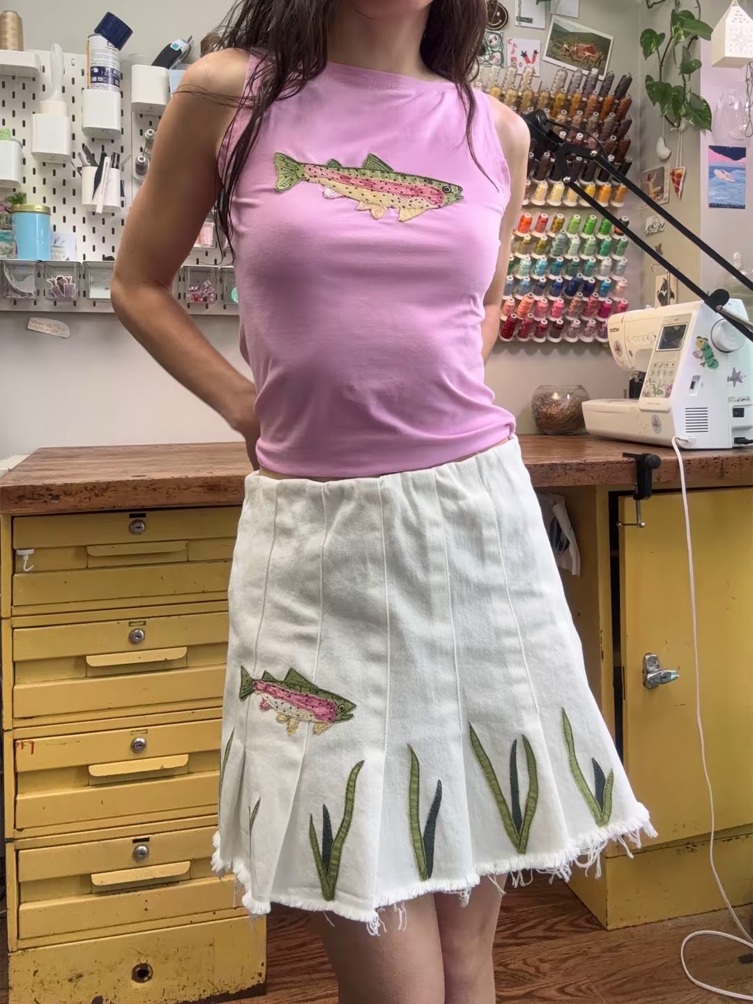 Design Details: The vest is embroidered with a three-dimensional rainbow trout pattern, using green, pink, and yellow colors to recreate the fish's texture. The embroidery is exquisite and vivid, incorporating natural elements into a simple vest, making this basic style unique and individualistic.