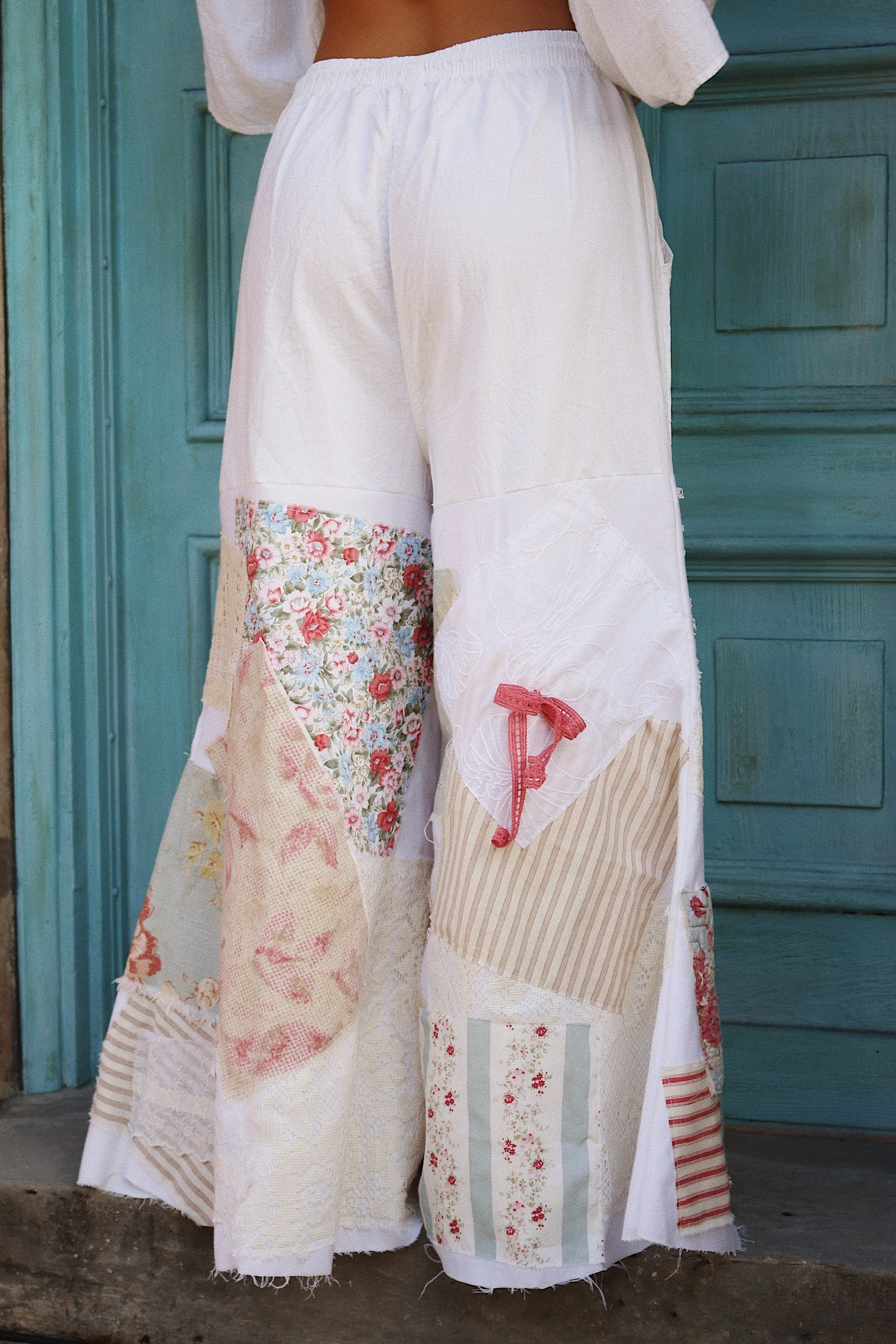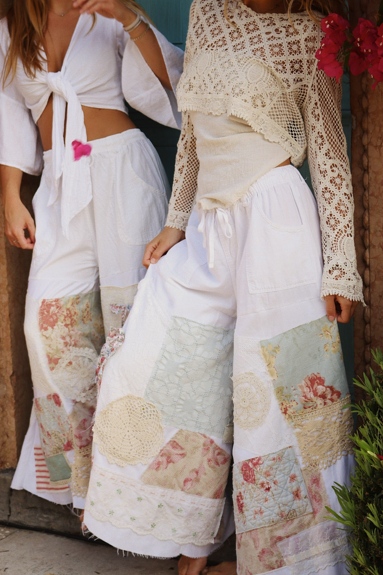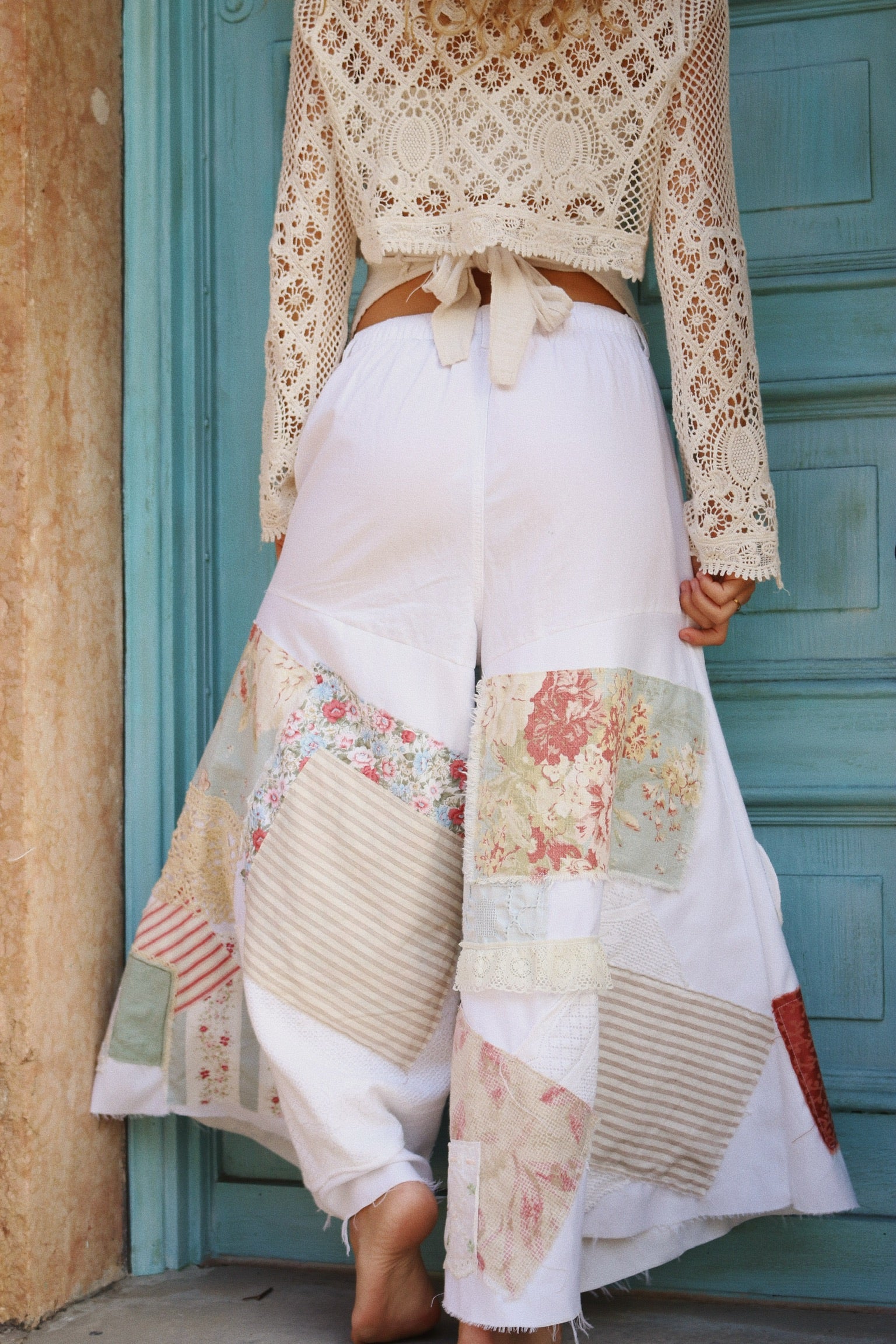 Unique patchwork linen pants made from vintage fabrics sourced globally, skillfully crafted using a blend of crochets, laces, quilts, and vintage materials, adding a touch of vintage charm to your wardrobe. The fabrics used are reworked and found secondhand.
