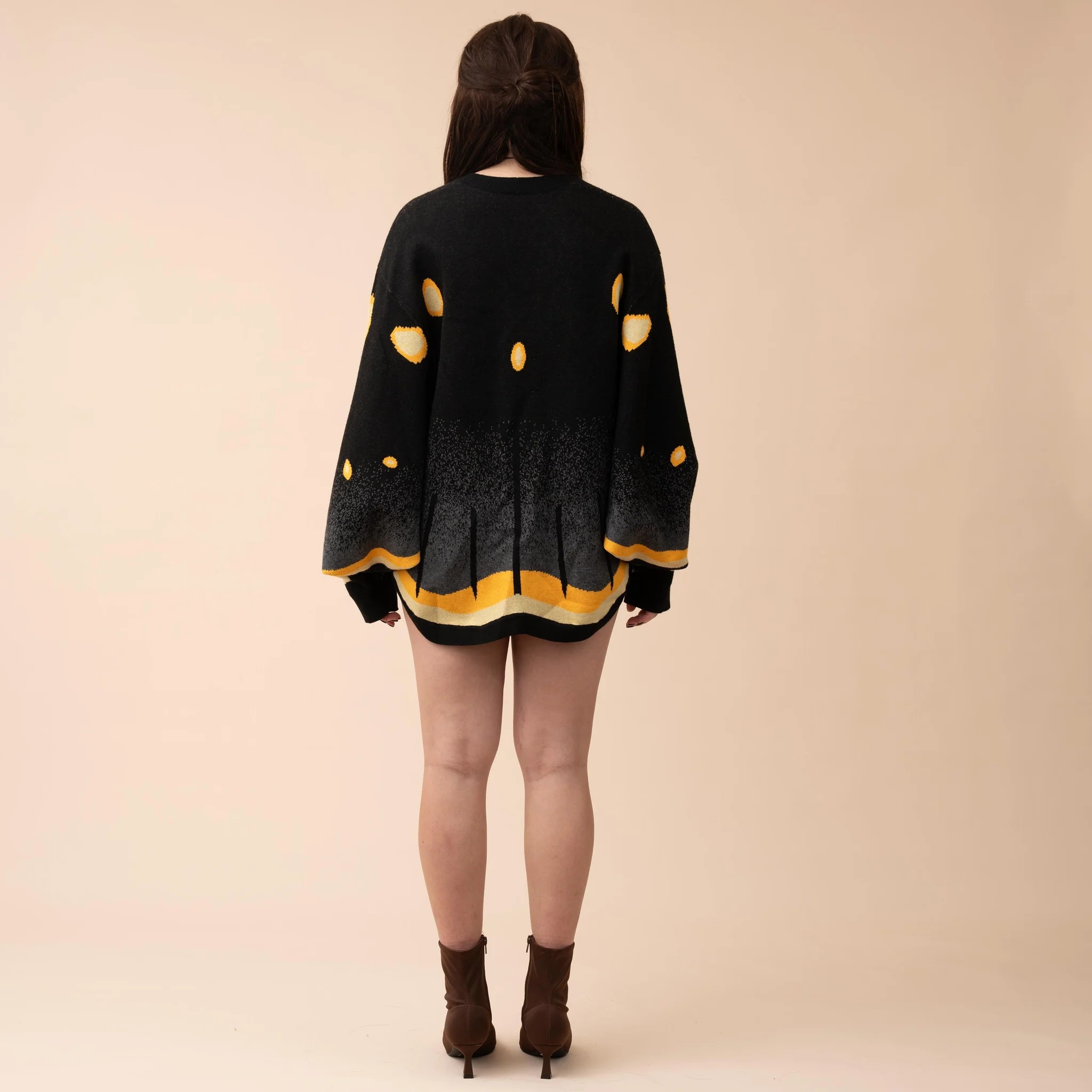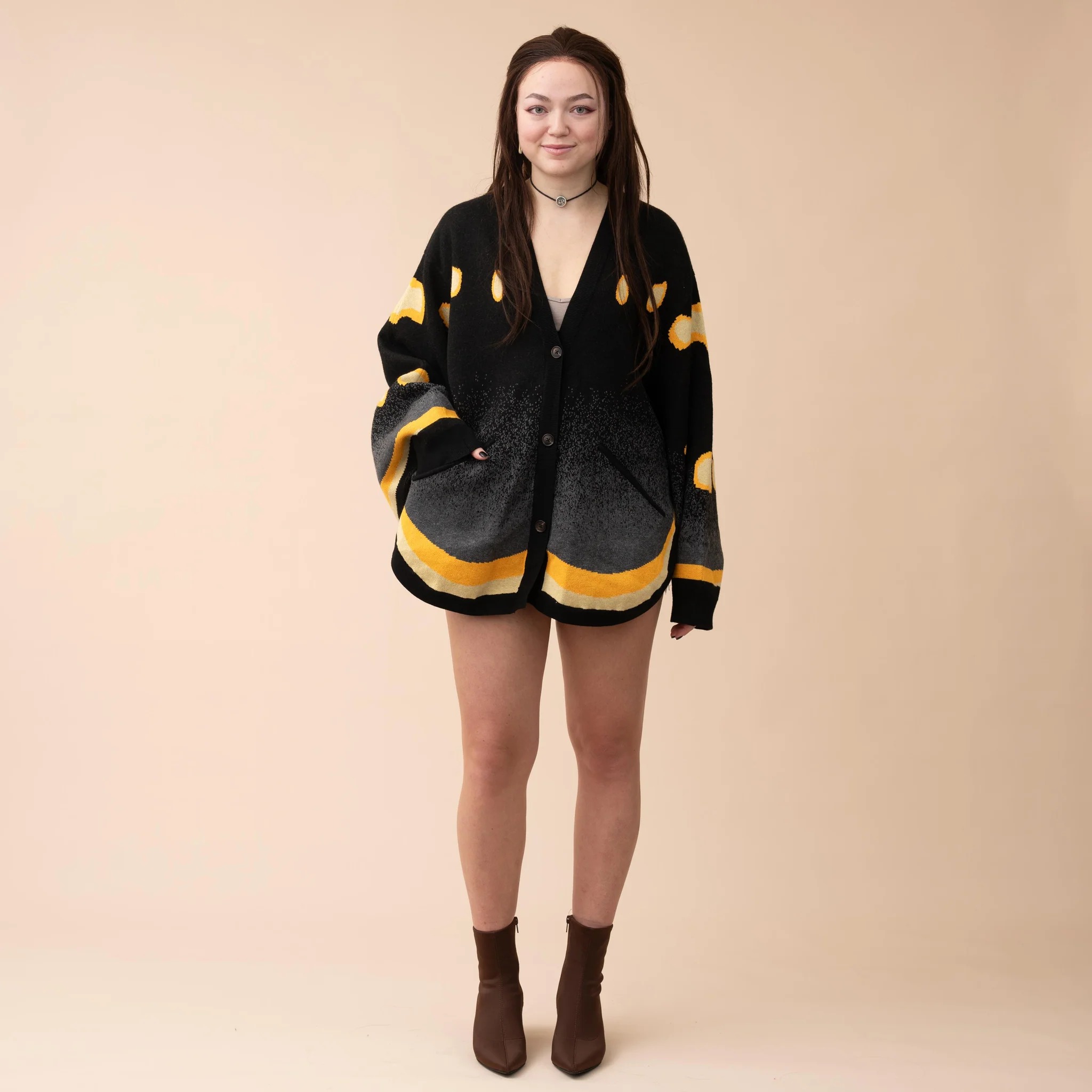 A moody, dramatic statement piece that brings the elusive smoky emperor moth to life as wearable art. This cardigan features a deep black base with a gradient smoky grey fade along the wing edges, accented by bold golden-yellow trim and scattered cream spots—mirroring the moth’s striking nocturnal markings. The oversized wing silhouette spreads dramatically when worn open, creating an otherworldly, eye-catching effect, while a V-neck button-front adds subtle structure. Crafted from a plush, lightweight knit, it balances cozy warmth with a fluid drape, making it perfect for pairing with shorts and ankle boots (as shown) or adding a darkly whimsical touch to dresses and jeans.