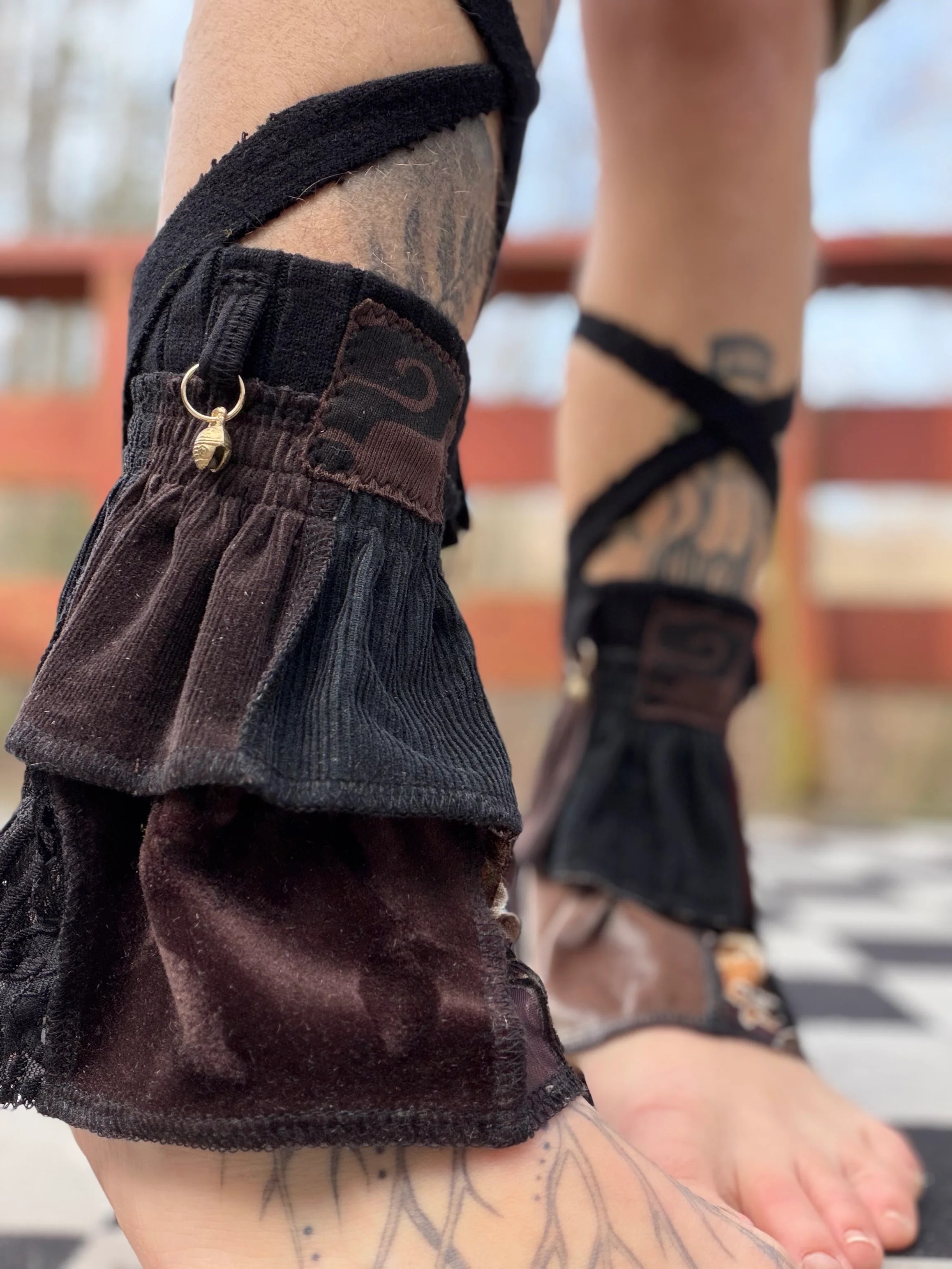 This handcrafted leg warmer set blends moody bohemian charm with vintage texture—crafted from layered patchwork fabrics (deep brown corduroy, black ribbed knit, and velvet with abstract patterns), it features a subtle tonal applique motif for an understated artisanal vibe. The sleek black crisscross ties wrap snugly around the calf, while tiny brass bells add a soft jingle with movement. The ruffled layered hem (mixed with delicate lace trim) pairs perfectly with bare feet or chunky boots, making it a versatile statement accessory for casual outings, festivals, or eclectic-style outfits.