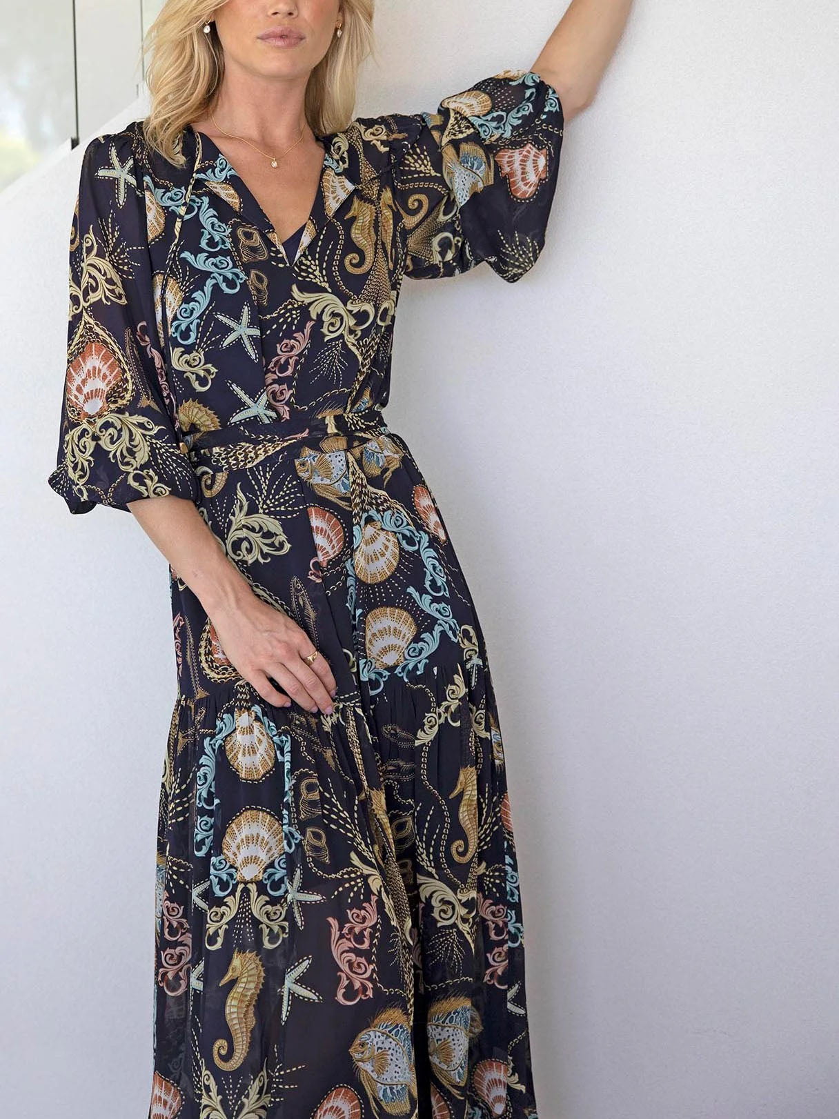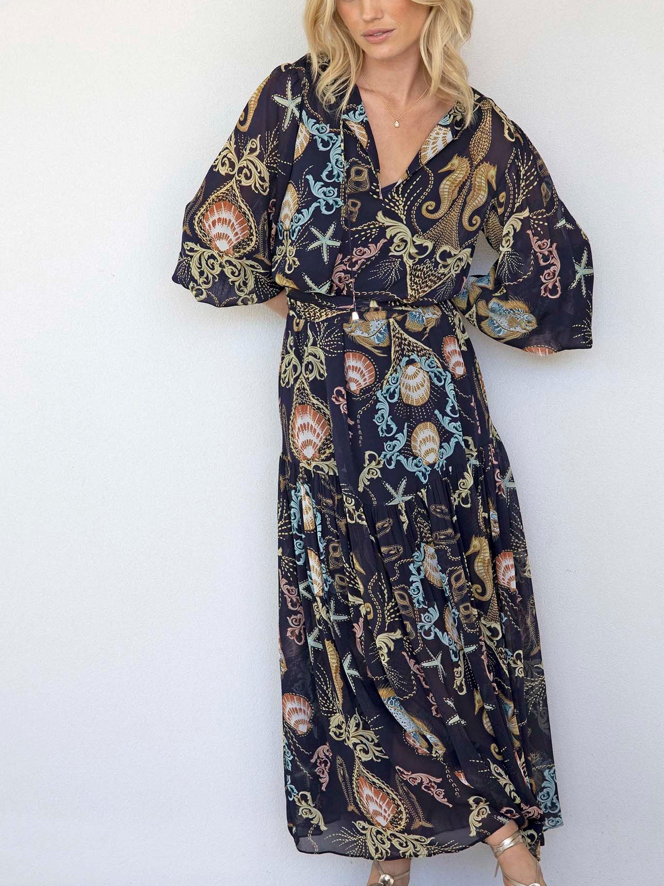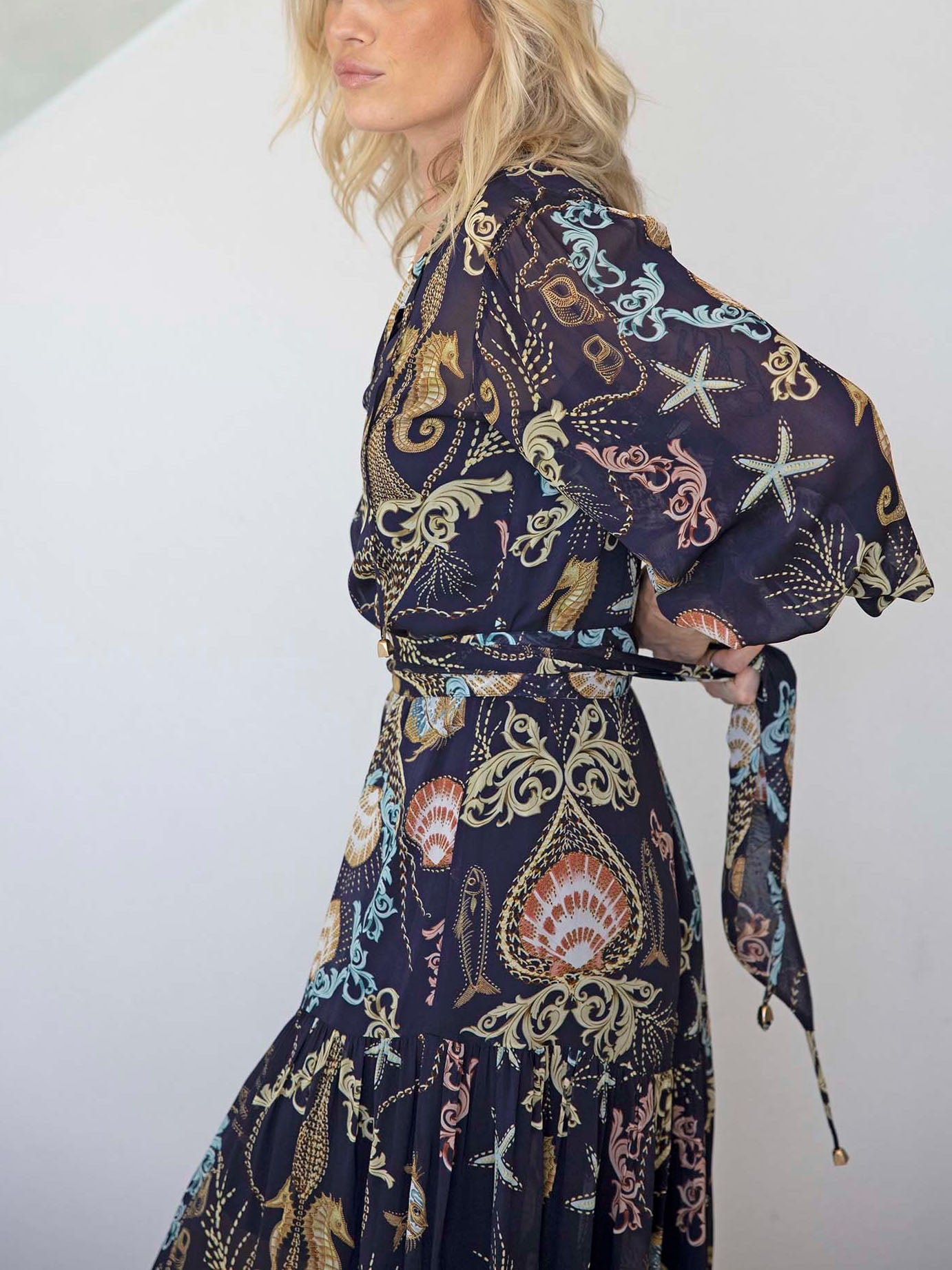 This women’s maxi dress blends coastal charm with elegant whimsy—featuring a deep navy base adorned with intricate nautical prints (seahorses, seashells, starfish, and ornate scrollwork in gold, teal, and coral accents). It showcases full-length balloon sleeves with elastic cuffs, an open neckline with a tie detail, and a flowy silhouette. The model styles it with a matching solid camisole dress underneath for a polished look, while the lightweight chiffon fabric lends an airy, graceful drape. A fabric belt is included to add subtle waist definition as desired.
