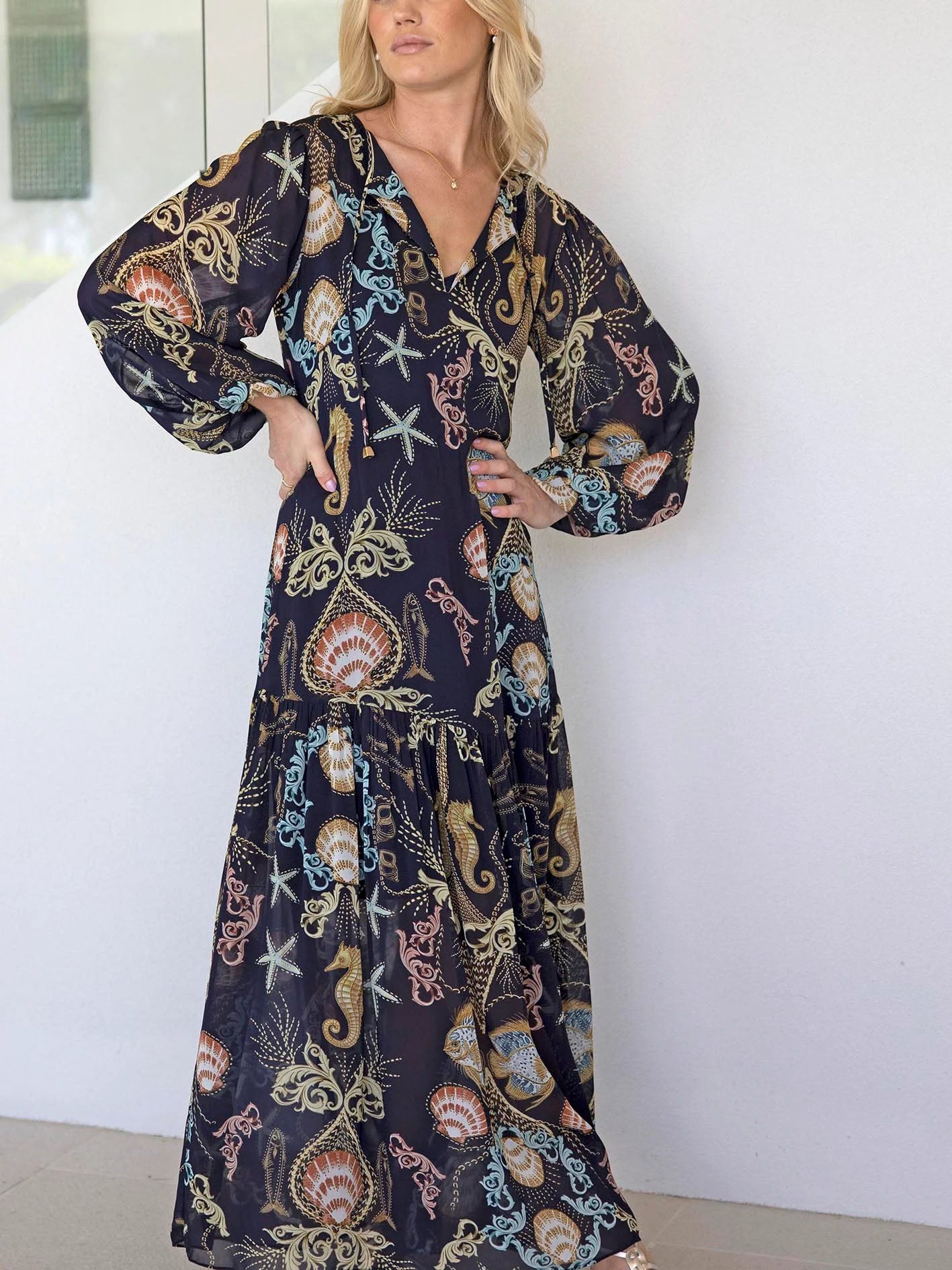 This women’s maxi dress blends coastal charm with elegant whimsy—featuring a deep navy base adorned with intricate nautical prints (seahorses, seashells, starfish, and ornate scrollwork in gold, teal, and coral accents). It showcases full-length balloon sleeves with elastic cuffs, an open neckline with a tie detail, and a flowy silhouette. The model styles it with a matching solid camisole dress underneath for a polished look, while the lightweight chiffon fabric lends an airy, graceful drape. A fabric belt is included to add subtle waist definition as desired.✨ Details- Material: Lightweight chiffon